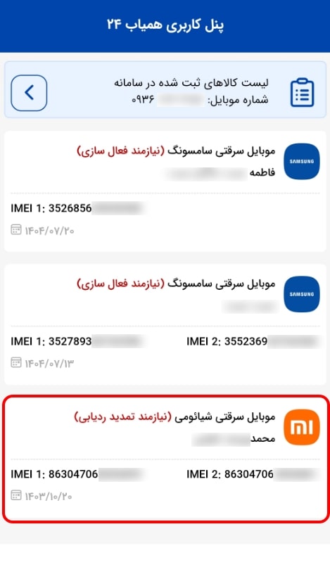 با ورود به بخش پیگیری، میتوانید از امکانات متنوع سامانه مانند بیمه موبایل همیاب۲۴، مشاهده وضعیت ردیابی، تمدید دوره ردیابی، چاپ نتیجه ردیابی، ویرایش مشخصات کالا و چاپ اطلاعات دستگاه استفاده نمایید.